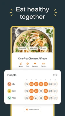 Are you in charge of the family meal planning? Easily add more people to your meal plan. They can join you for specific meals or for your whole meal plan. Plus, you can share a login so everyone has access the meal planner and grocery list.